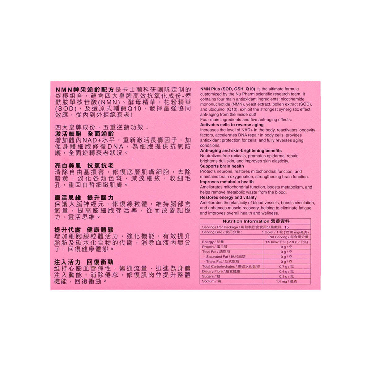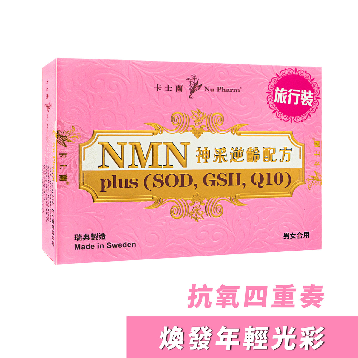 NMN Plus (SOD, GSH, Q10) originating from Sweden, contains 4 key ingredients, Nicotinamide mononucleotide (NMN), Superoxide Dismutase (SOD), Glutathione (GSH), and reduced coenzyme Q10. This formula effectively neutralises free radicals, repairs and enhances mitochondrial function, thus strengthening overall health. It fights aging by addressing the root causes, targeting cellular and metabolic processes that contribute to aging, for a more youthful and vibrant appearance.