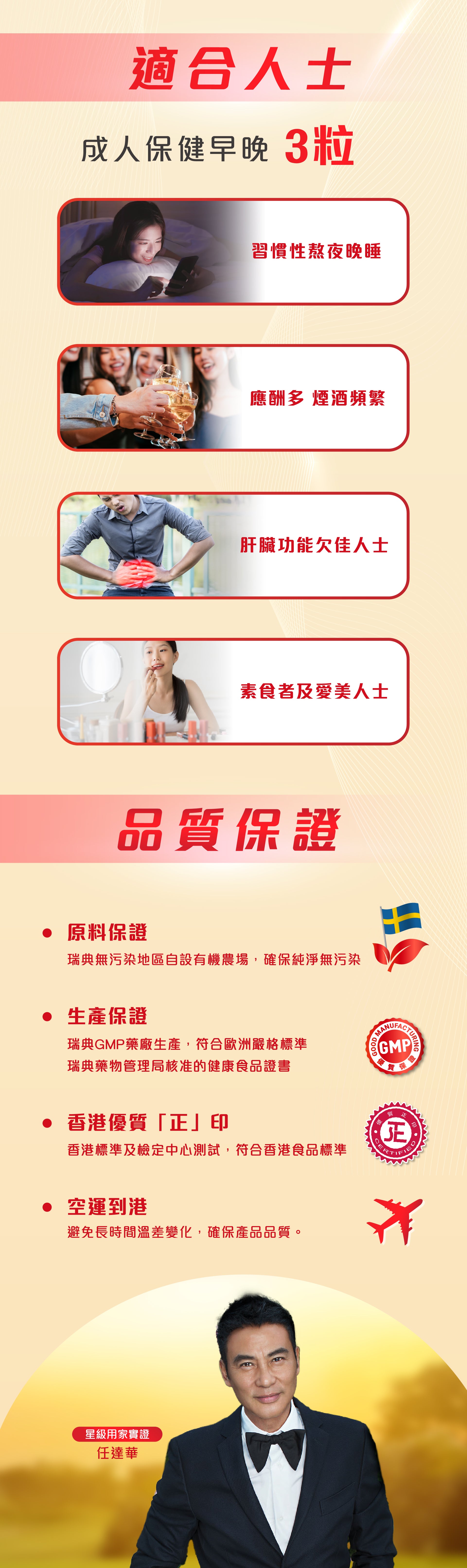 成人保健:早、晚各3粒 儿童(3岁或以上):早、晚各1粒 特别需要人士:早、午、晚各3-5粒 饮酒应酬:酒前45-60分钟4-5粒,酒后4-6粒,及酒后翌日3-4粒 *适合长期服用,空肚饱肚服用均可,如胃弱者餐后服用 *有需要人士可调节服用量,需配合均衡饮食,详情请向我们的健康顾问查询。