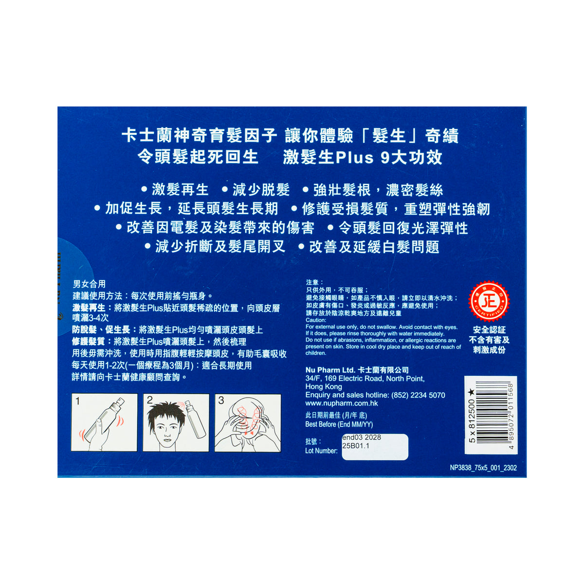 1. 每次使用前摇匀瓶身。 2. 激发再生:将激发生贴近头发稀疏的位置,向头皮层喷洒3-4次。 防脱发、促生长:将激发生均匀喷洒头皮头发上。 修护发质:将激发生喷洒头发上,然后梳理。 3. 用后毋需冲洗,使用时用指腹轻轻按摩头皮,有助毛囊吸收。 每天使用1-2次(一个疗程为3个月),适合长期使用;遵从指引每天使用可达最佳效果。 详情请向卡士兰健康顾问查询。 注意:只供外用,不可吞服;避免接触眼睛,如产品不慎入眼,请立即以清水冲洗;如皮肤有伤口或发炎,应避免使用。