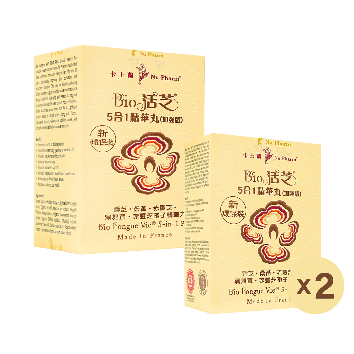 卡士兰Bio活芝® 5合1丸(加强版)蕴含五种珍贵菇菌成分,包括云芝、桑黄、赤灵芝、黑舞茸、赤灵芝孢子。全新加强版配方以近年国际公认及疗效显著的药用菇菌——桑黄为主调,再配上其他4种历史悠久的菇菌,组成强大的身体防御屏障,全面调理体质,增强免疫力和对抗顽疾。而利用「无土瓶」有机栽种技术提炼,能杜绝重金属及有害物质,最大程度保存当中既珍贵的有效活性成分,令身体更容易吸收利用。